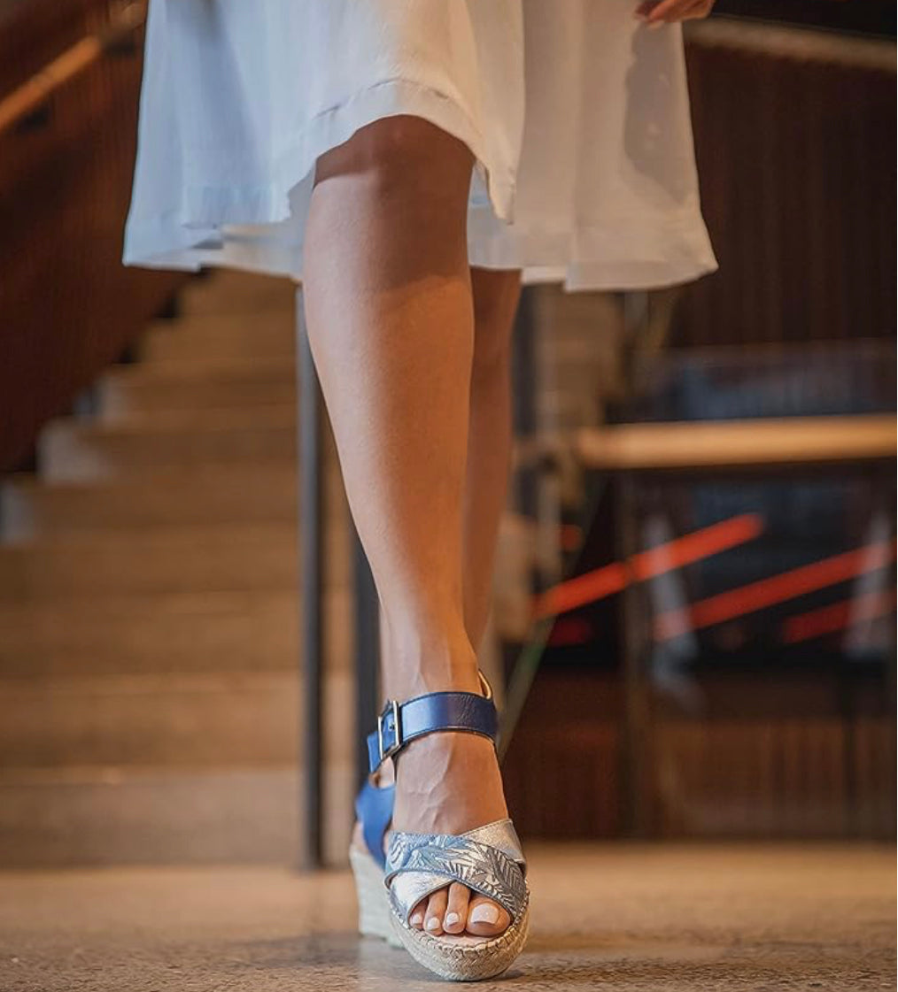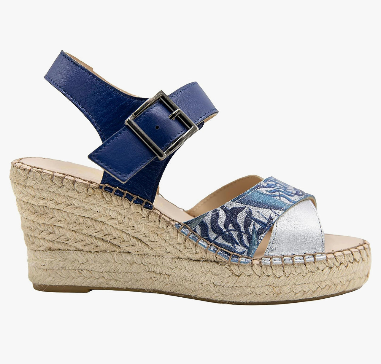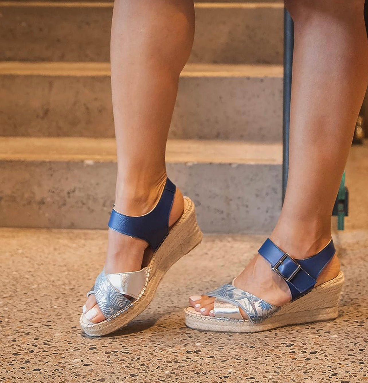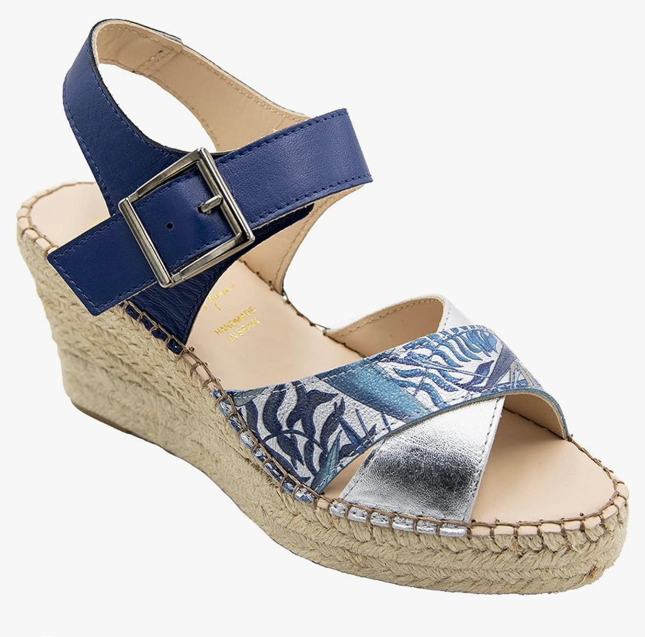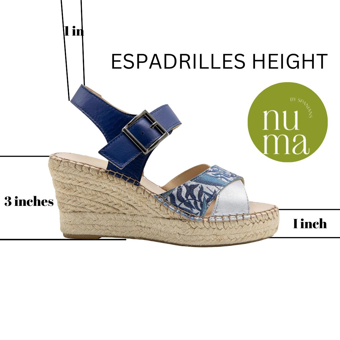 Handcrafted in Spain, these leather espadrilles feature classic cross stripes, an ankle strap for a secure fit, and a 1"–3" platform. Designed for all-day comfort and style, they blend traditional and modern looks with vibrant patterns and colors.